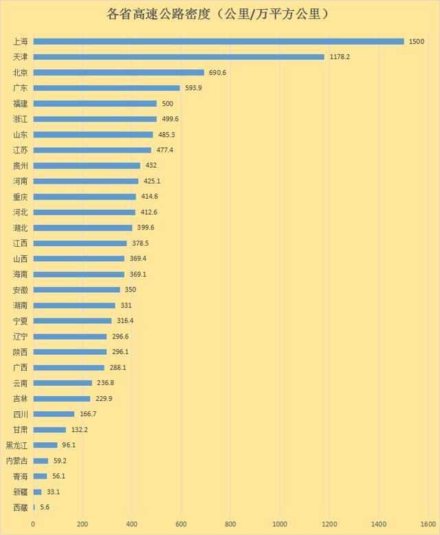 单以里程数来评价高速公路发达情况是不够准确的,因为有些省份本来面积就小,高速里程数自然就小很多。不过通过高速公路密度就可以看出差距。