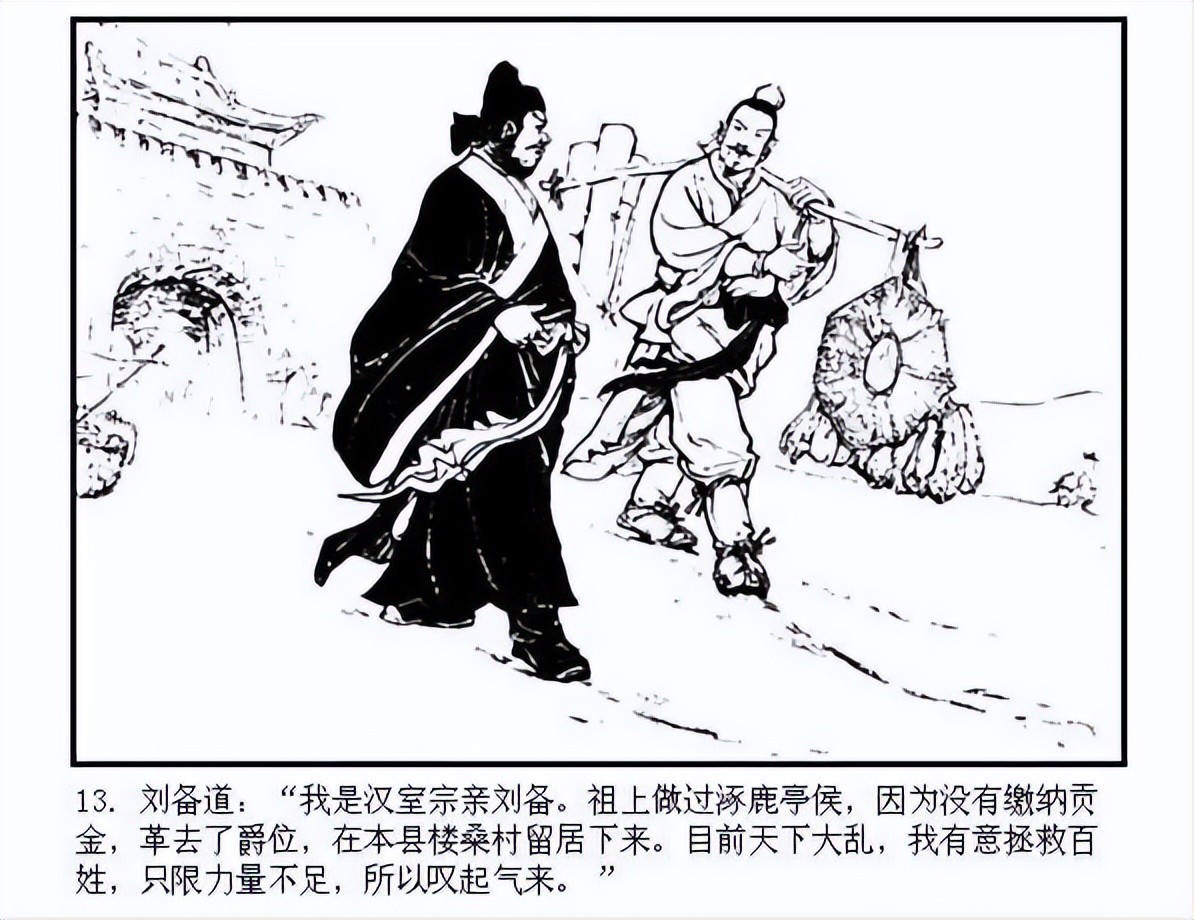 故事发生在东汉灵帝年间,刘备因家道中落,以卖草鞋和草席为生。他心怀大志,希望恢复汉室江山。在一次偶然的机会中,刘备结识了豪杰关羽和张飞。关羽因杀了恶霸而逃亡,张飞则是一位家财万贯的屠夫。三人一见如故,志趣相投,都渴望为国家效力,扫除奸佞。