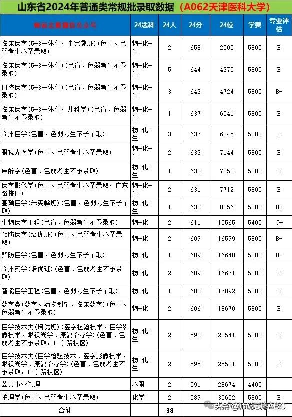 天津医科大学2024年全国校友会排名第115名,天津市排名第4名。2024年在山东省招生专业最低录取分589分(30602)-658分(2000)。
