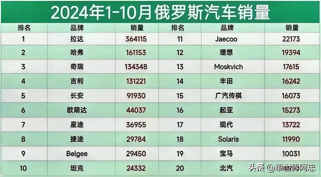 万万没想到,如今的国产车竟然如此受欢迎,不仅国内销量持续高涨,而且在俄罗斯竟然还实现了一家独大。小编刚从乘联会获悉,2024年1-10月俄罗斯汽车品牌销量排行榜已揭晓!依据数据显示,1-10月共有3家车企销量突破10万辆大关,拉达表现亮眼夺得桂冠,哈弗,奇瑞荣获亚季军,吉利,长城都进前五,欧萌达,星途,捷途,Belgee,坦克均入围榜单前十,丰田第14,北汽表现一般。