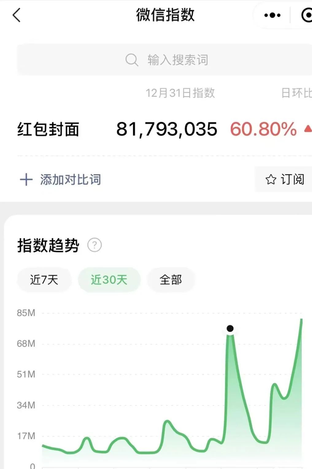 先来看看,微信搜索指数里面“红包封面”的搜索量一直在飙升,每天增长速度约在60.80%,所以我们现在加入,还是算早的。