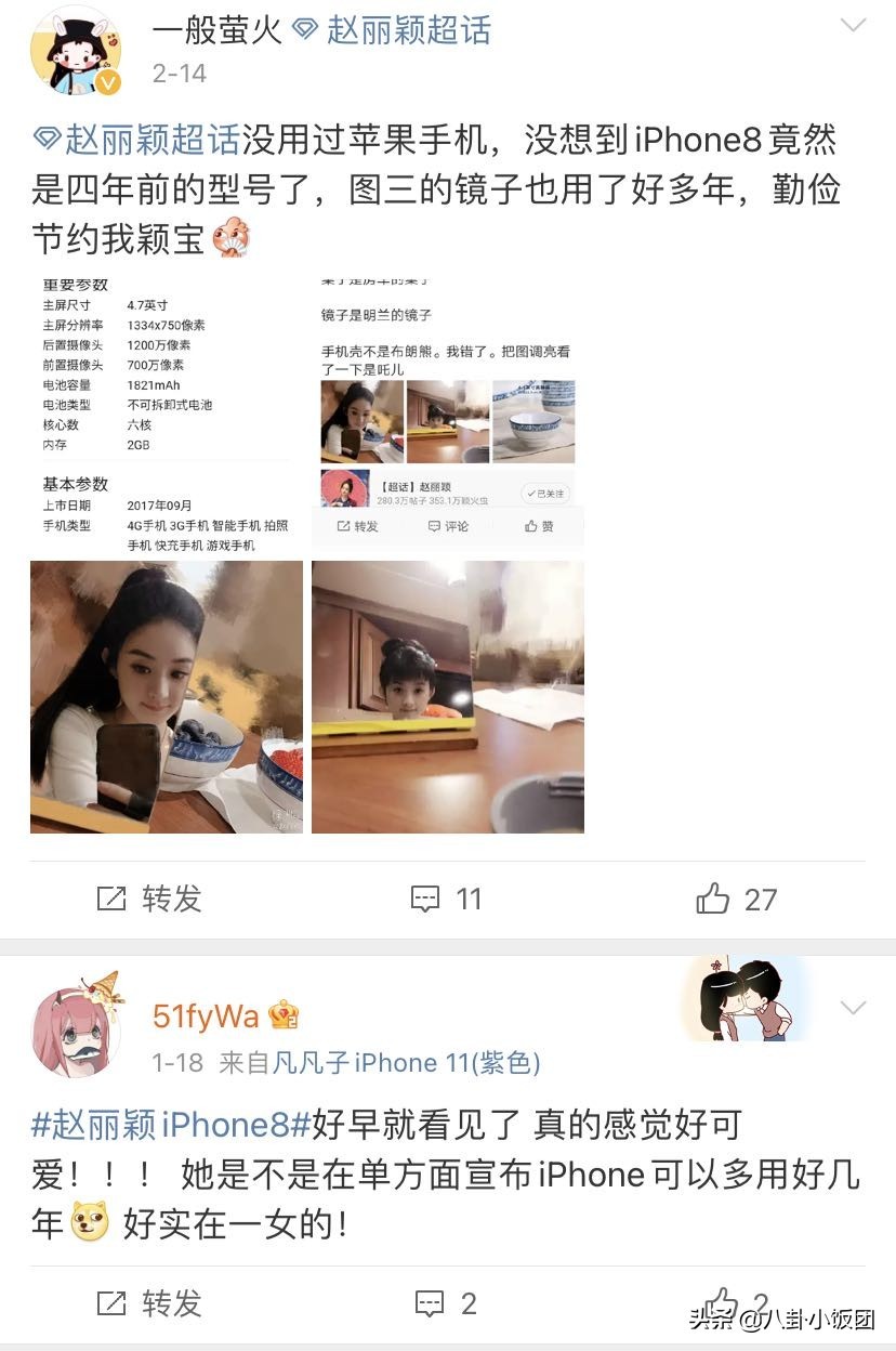 不过,有眼尖的网友并没有将关注的焦点放在两位女星的深厚友谊上。而是意外发现赵丽颖发文的客户端所显示的手机型号竟然是iPhone8。