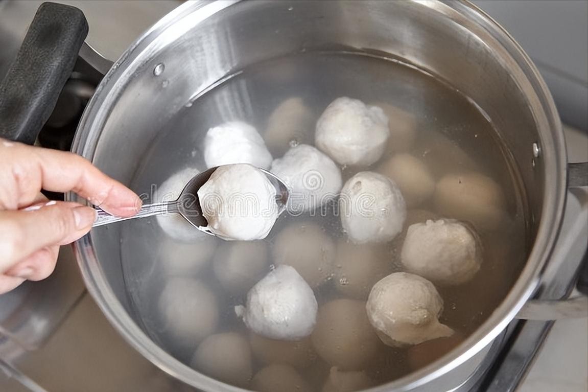 4、锅子中添上足量的冷水,然后把鱼糜团成一个个的小丸子,下入冷水锅中。等所有丸子都放进去后,就可以开火煮了,大火煮开了之后,再继续煮上1分钟的时间,丸子就熟了。