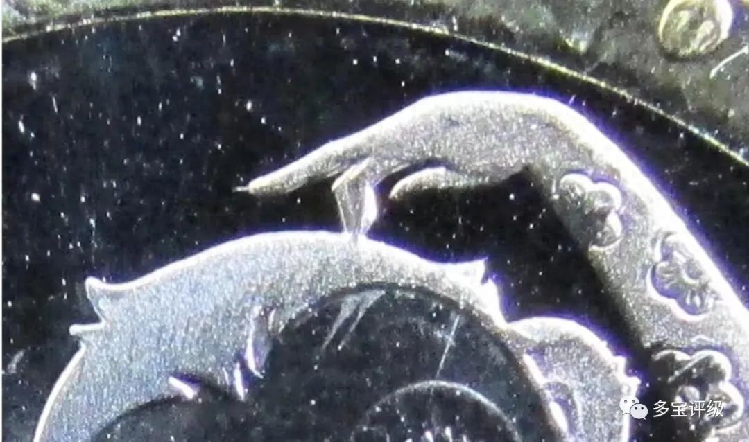 四、二轮猴局部硬伤较多,大大降低了纪念币的质量。从笔者手中的纪念币上看,一些纪念币表面存在明显的凿痕,这些凿痕,有些是纪念币之间摩擦形成的,一些是受到外部重力冲压所致,痕迹较深。这些凿痕的存在大大降低了纪念币的质量。图片上半部猴子的中指指尖像要被切断似的,下半部分猴子手背像似受了伤。