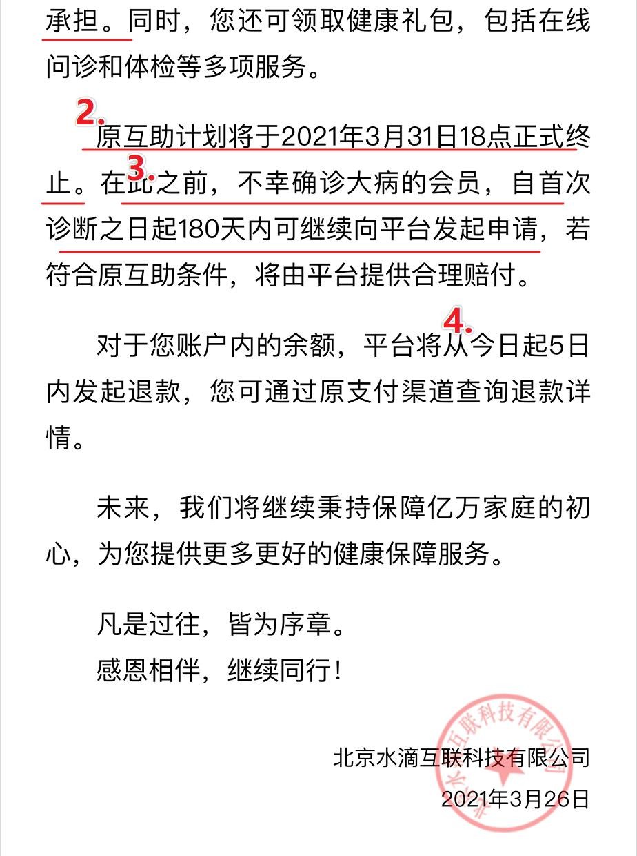 刚刚,水滴互助平台发布公告,宣布互助计划自3月31日18点正式终止,原文如上。