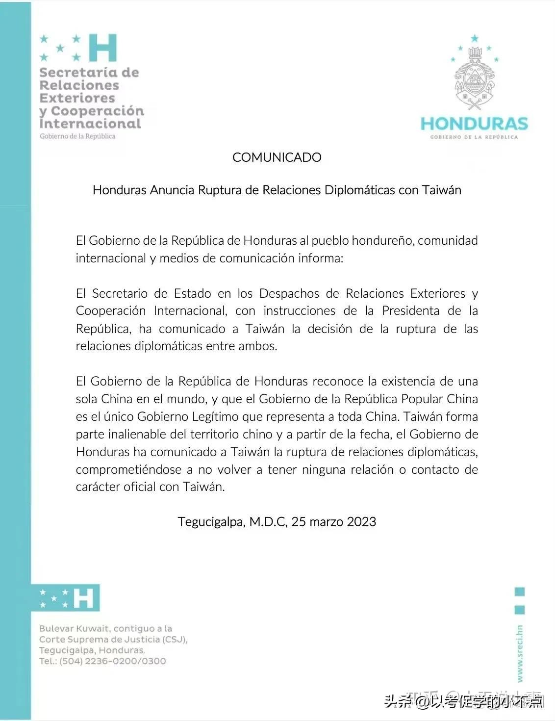 当地时间3月25日,洪都拉斯外交部发表声明,正式宣布与中国台湾断绝“外交关系”。