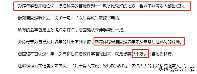 孙涛的母亲认为唐国强是个分外绝情的人,“只见新人笑,不闻旧人哭。”