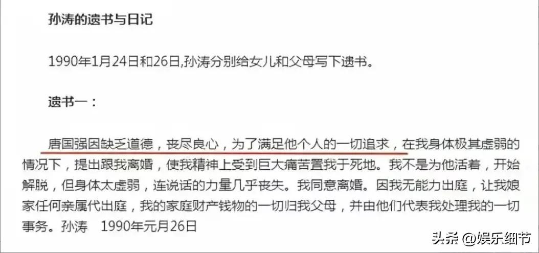 一封遗书是给孙涛的父母的,上面字字血泪,皆是唐国强对她离婚的逼迫。