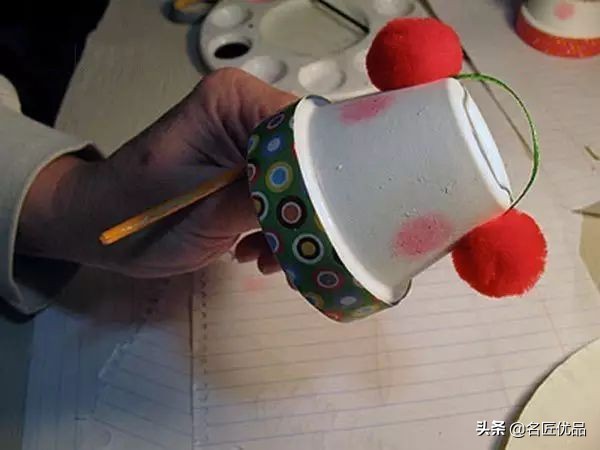 最后将所有这些部件用胶水粘合在一起,并画上眼睛、嘴巴、纽扣、腮红,一个雪人模型就制作完成了!
