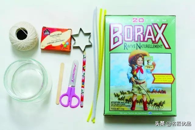 准备材料:毛根,绳子,铅笔,玻璃瓶,硼砂,开水