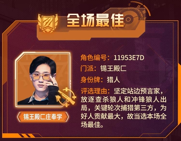 本次表演赛现场可谓是精彩纷呈,大神们纷纷上演“名场面”。申屠展现出自己对狼人杀游戏的理解,大秀逻辑技巧;主播庄奉学手拿猎人身份牌全程坚定站边预言家,以冷静的头脑接连放逐多位狼人出局,并成功捕猎第三方阵营,一举获得本次表演赛的全场最佳。