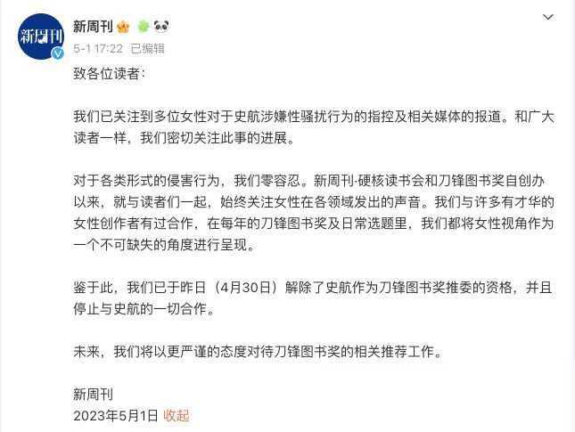 事件曝光后,磨铁图书和《新周刊》两大文化巨头迅速作出反应。磨铁图书不仅删除了史航的推荐语,还明确表示对于任何形式的侵害行为都持零容忍态度。而《新周刊》更是果断解除了史航作为刀锋图书奖推委的资格,并全面停止与其的合作。这两大机构的举动,无疑向外界传递出一个明确的信息:对于涉及性骚扰的艺人,合作方将不再给予任何宽容。