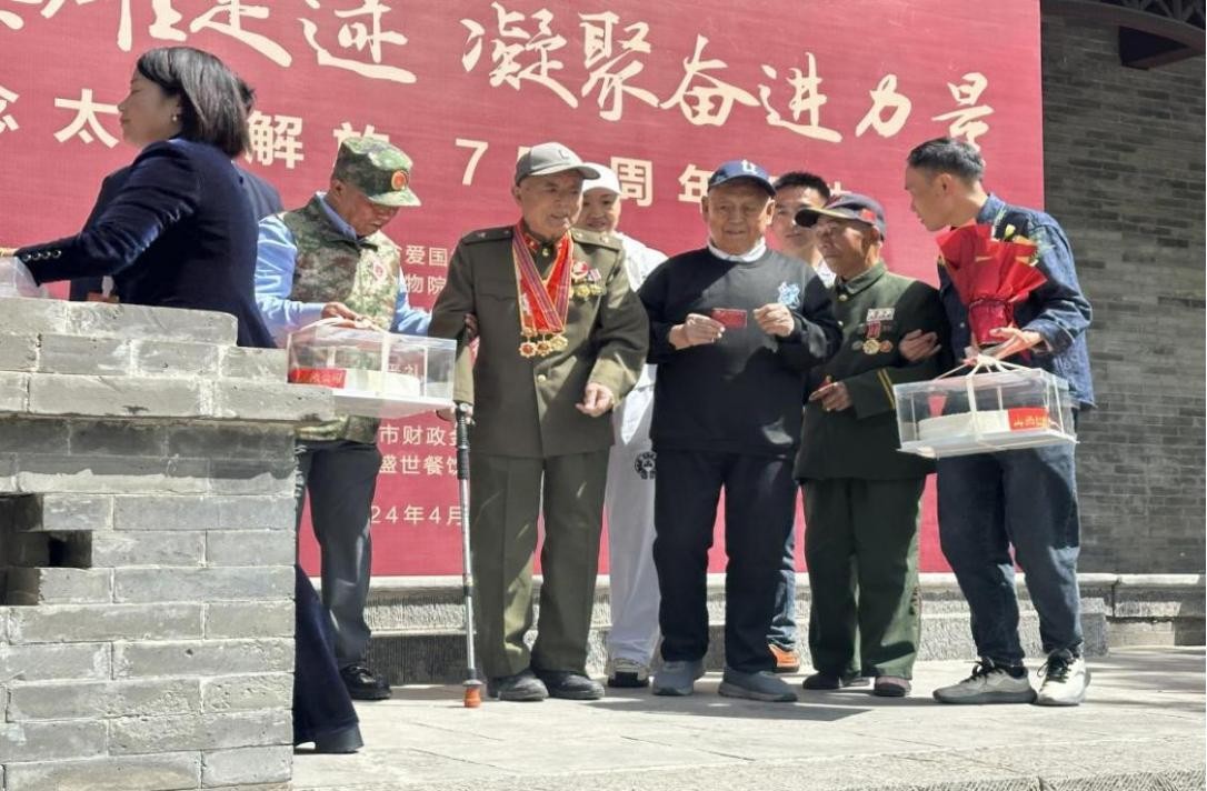 学生代表向参战老兵代表献花,并进行集体宣誓。拥军企业代表向参战老兵代表赠送“太原解放生日贺卡”。