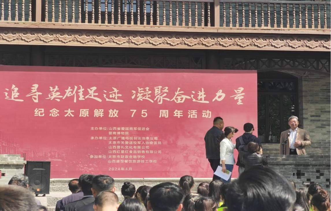 4月24日是太原解放75周年纪念日,为重温先烈事迹,继承烈士遗志,传承红色基因,24日上午,由山西省爱国拥军促进会和晋商博物院联合主办的“追寻英雄足迹,凝聚奋进力量”纪念太原解放75周年活动在晋商博物院举行,山西省爱国拥军促进会执行副会长邢劲力主持活动,参战老兵代表、学生代表、志愿者等200余人参加纪念活动。太原旅游职业学院双拥办公室、绿色能量社团成员参加,并承担了部分志愿服务工作。