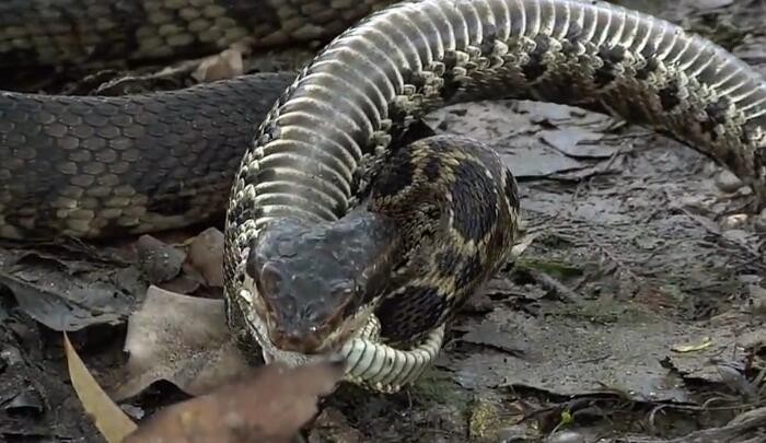 水腹蛇残忍撕咬活吞响尾蛇,而响尾蛇竟然呆呆地躺着做这事!
