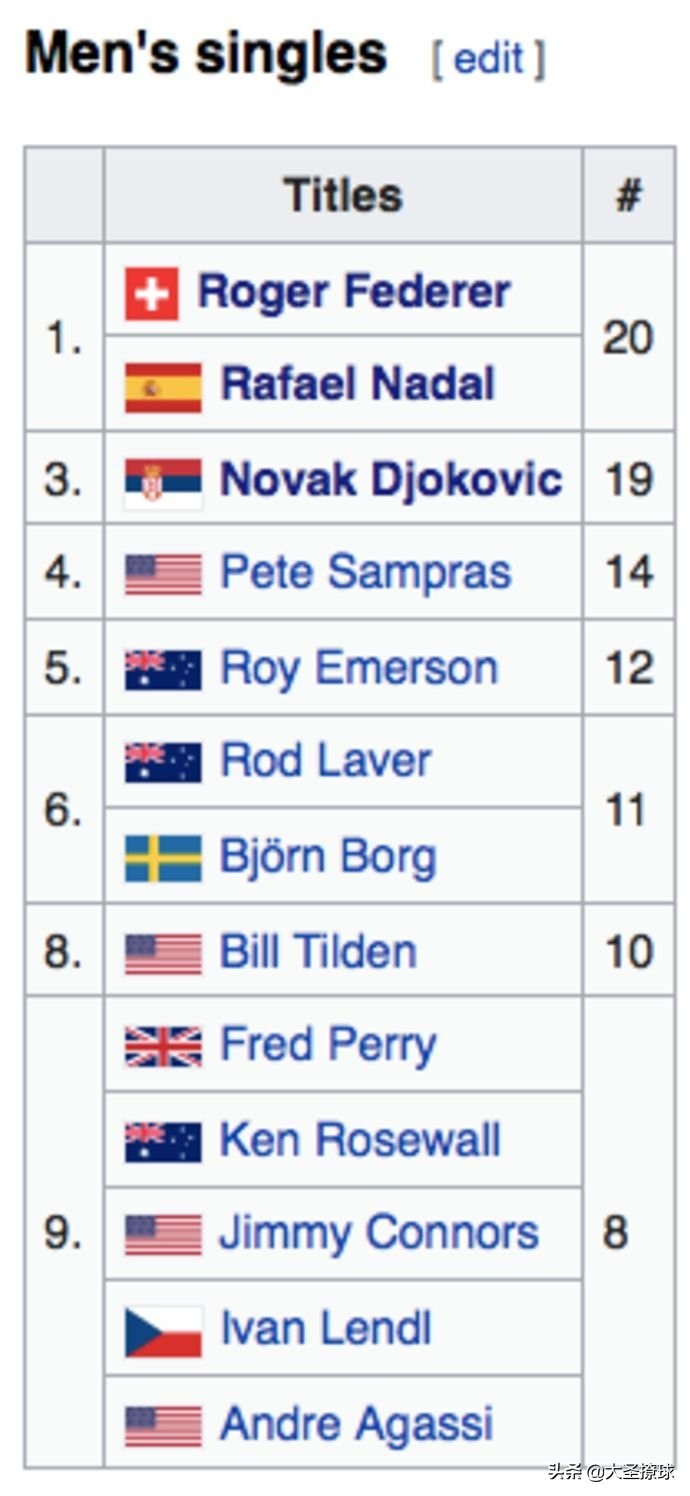 虽然三巨头(小德、费德勒和纳达尔)在传奇的职业生涯中足够伟大,但在单打大满贯数量的综合排行榜上,这三人都未能跻身前三名。