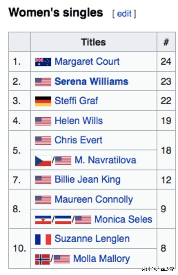 目前的三甲均被女球员所占据,德国的格拉芙、美国的塞雷娜·威廉姆斯和澳大利亚的玛格丽特·考特均超过了20次大满贯的男球员纪录。