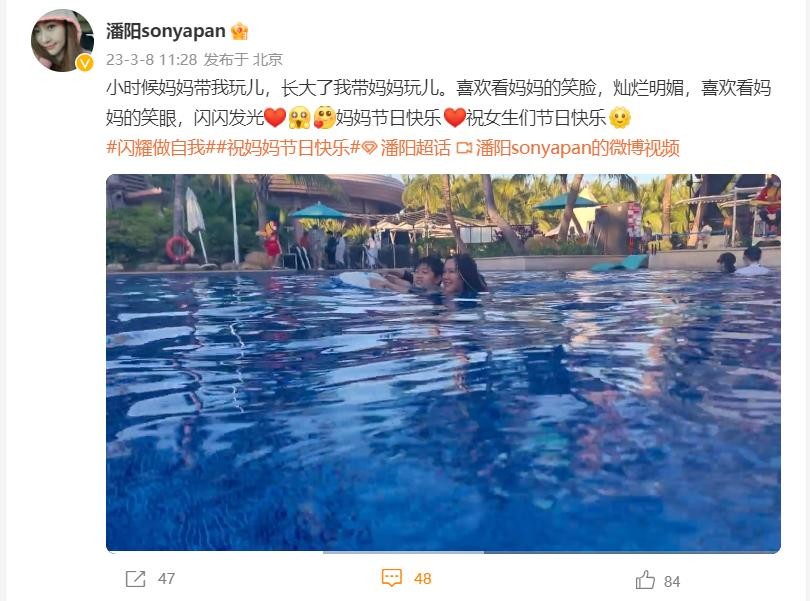 3月8日妇女节,潘阳发布视频祝福妈妈杨云节日快乐。画面中,杨云带着潘阳的儿子游泳,一老一小玩得非常开心,脸上挂满笑容。而他们游泳的地方,一看就知道是国内的游泳池。