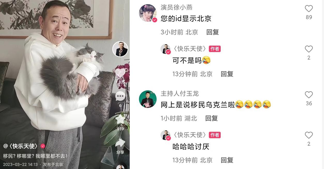 辟谣视频发布后,不少圈中好友跑来声援潘长江(快乐天使是其另一社交账号名字)。演员徐小燕写道,您的ID显示北京。潘长江笑言,可不是吗。主持人付玉龙调侃道,网上是说移民乌克兰啦。潘长江称,哈哈,讨厌。