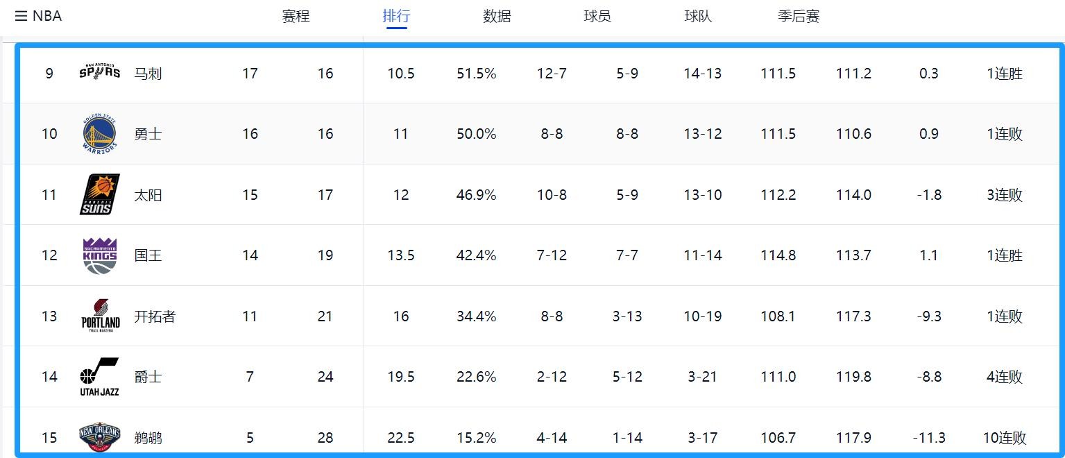 快船之前以19胜13负的战绩排名西部第五,今天惨败马刺36分,他们的战绩变为19胜14负,排名被掘金反超,快船暂时排名第六。马刺队之前以16胜16负的战绩排名第十,今天他们大胜快船过后,战绩为17胜16负,排名反超勇士上升至第九,只比排名第八的森林狼少0.5个胜场。