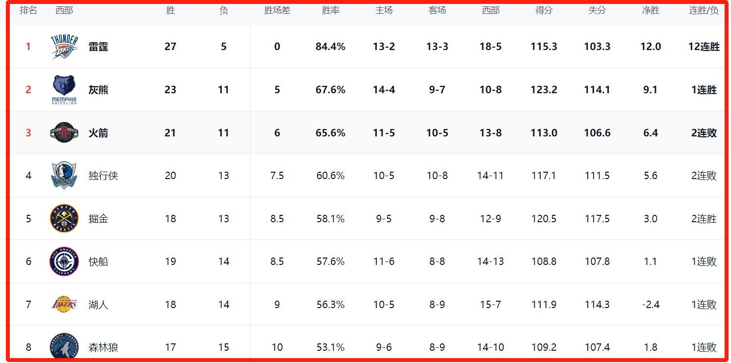 NBA西部排名!灰熊第2和火箭拉开差距,快船和湖人送掘金大礼进5