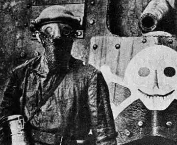 1930年,一名男子在俄罗斯穿着化学武器防护服