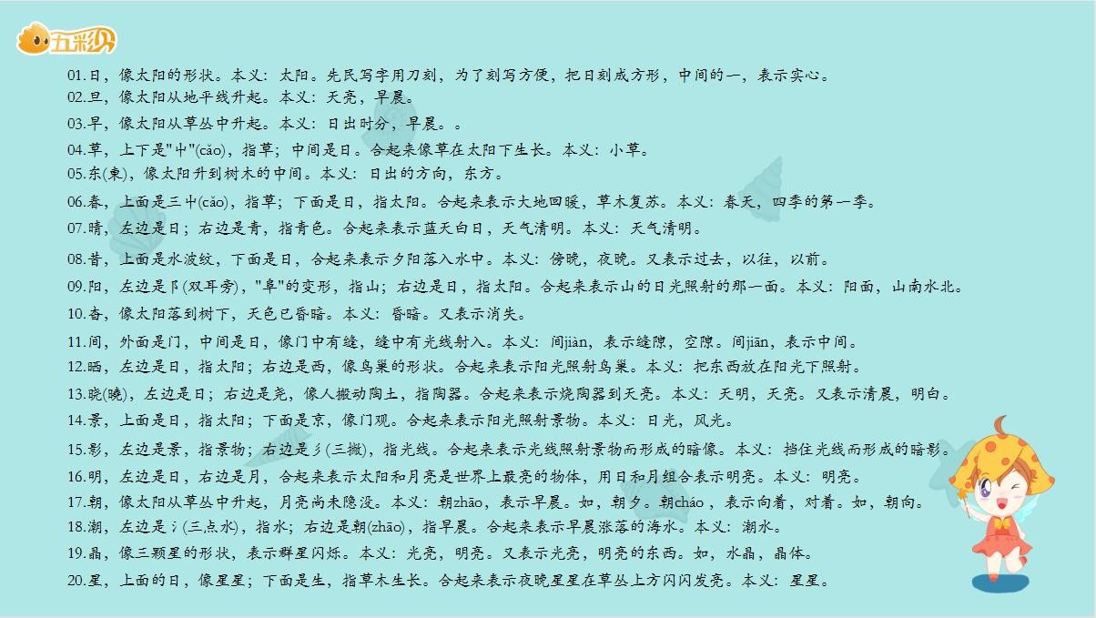 06.春,上面是三屮(cǎo),指草;下面是太阳,指太阳。合起来表示大地回暖,草木复苏。本义:春天,是四季的第一季。