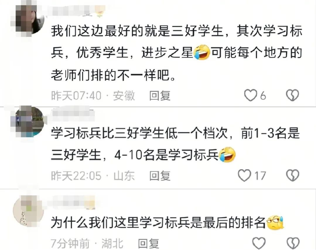 山东一网友更直接,说“学习标兵”比“三好学生”低一个档次, 前1到3名是“三好学生”,4到10名才是“学习标兵”呢。