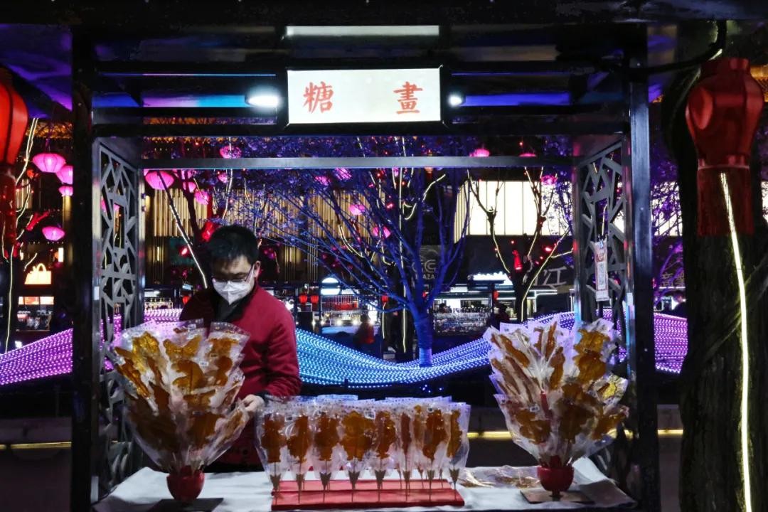 景观街上不光有各种巨型天灯引人驻足,隔三差五还能看到路旁的精致摆设,几串灯火、几家小铺,精致用心。