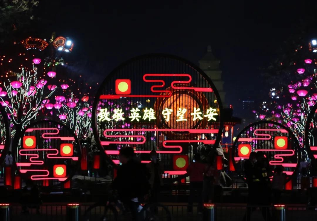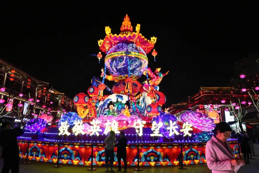 如果说不夜城最醒目的巨型天灯,从前带给人的是视觉震撼,那打上“致敬英雄守望长安”字样,就又多了一份温暖和动容。