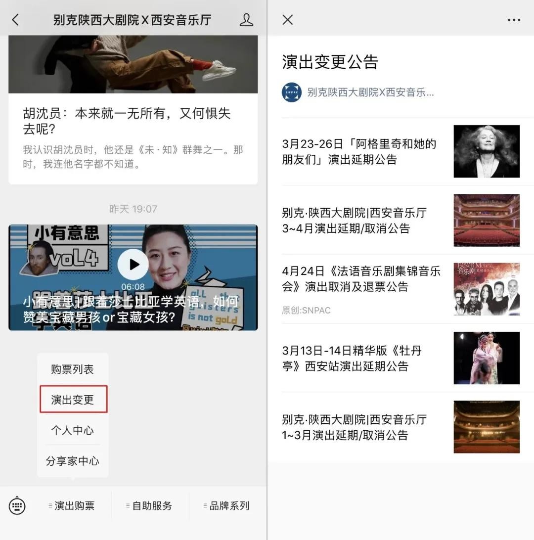 受疫情影响而取消或延期的演出,观众们可以在“别克陕西大剧院×西安音乐厅”公众号中办理退票登记。