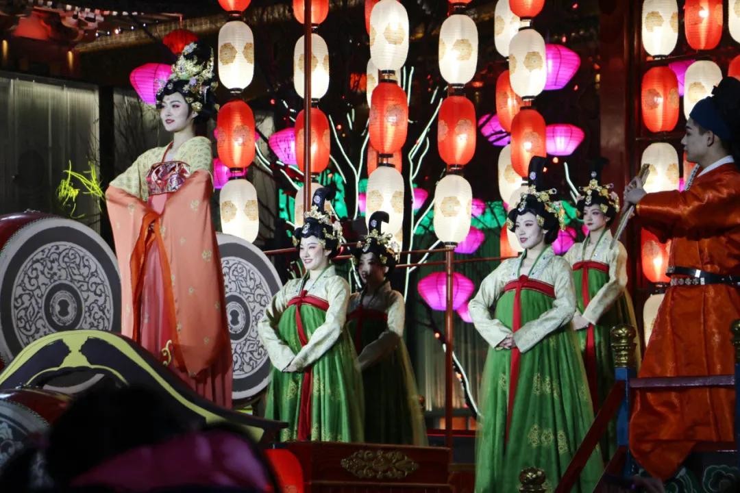 清一色的专业舞蹈演员,眉梢眼角尽是盛唐风情,服装配饰、舞姿步伐、花车装置处处讲究,不怪大家人挤人也要看,确实美轮美奂、让人不自觉就沉浸其中,半晌回不过神来。