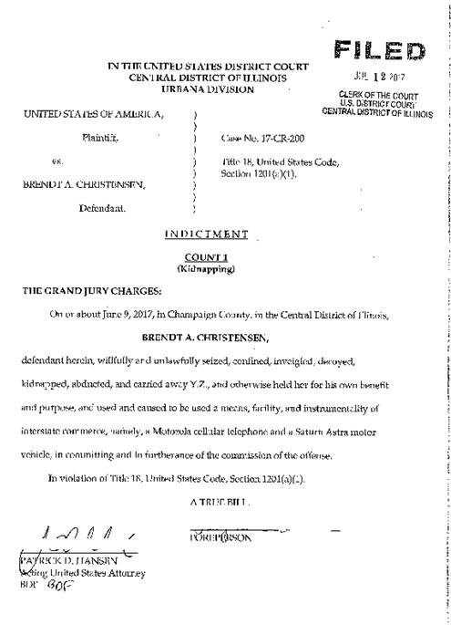 July 12: A federal grand jury indicts Christensen on charges of kidnapping. The Acting US Attorney Patrick D. Hansen and FBI Special Agent in Charge Sean Cox announce the indictment in a press release