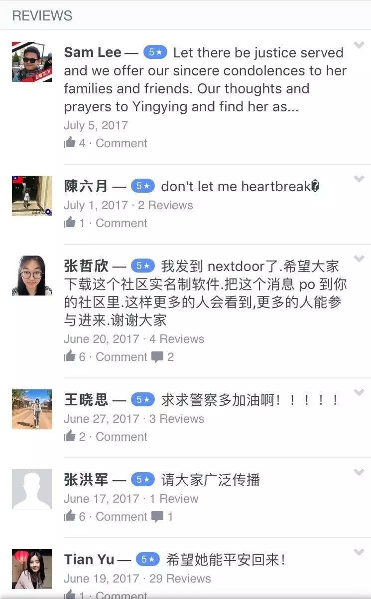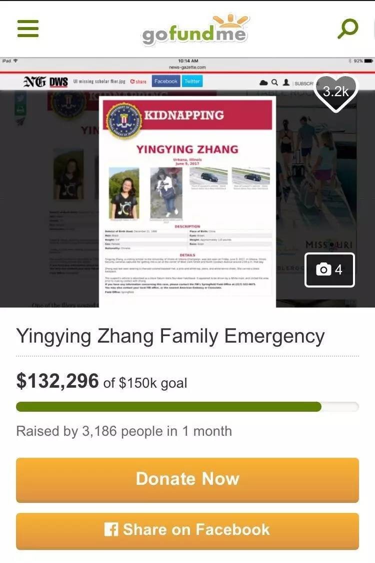 ▌6月17日,FBI以1万美金悬赏关于章莹颖所在位置的信息;校方通过GoFundMe 为章莹颖家人募捐。章莹颖家人抵美,由芝加哥领事馆工作人员接机并送到香槟,安顿住宿并与学校、警方见面沟通。
