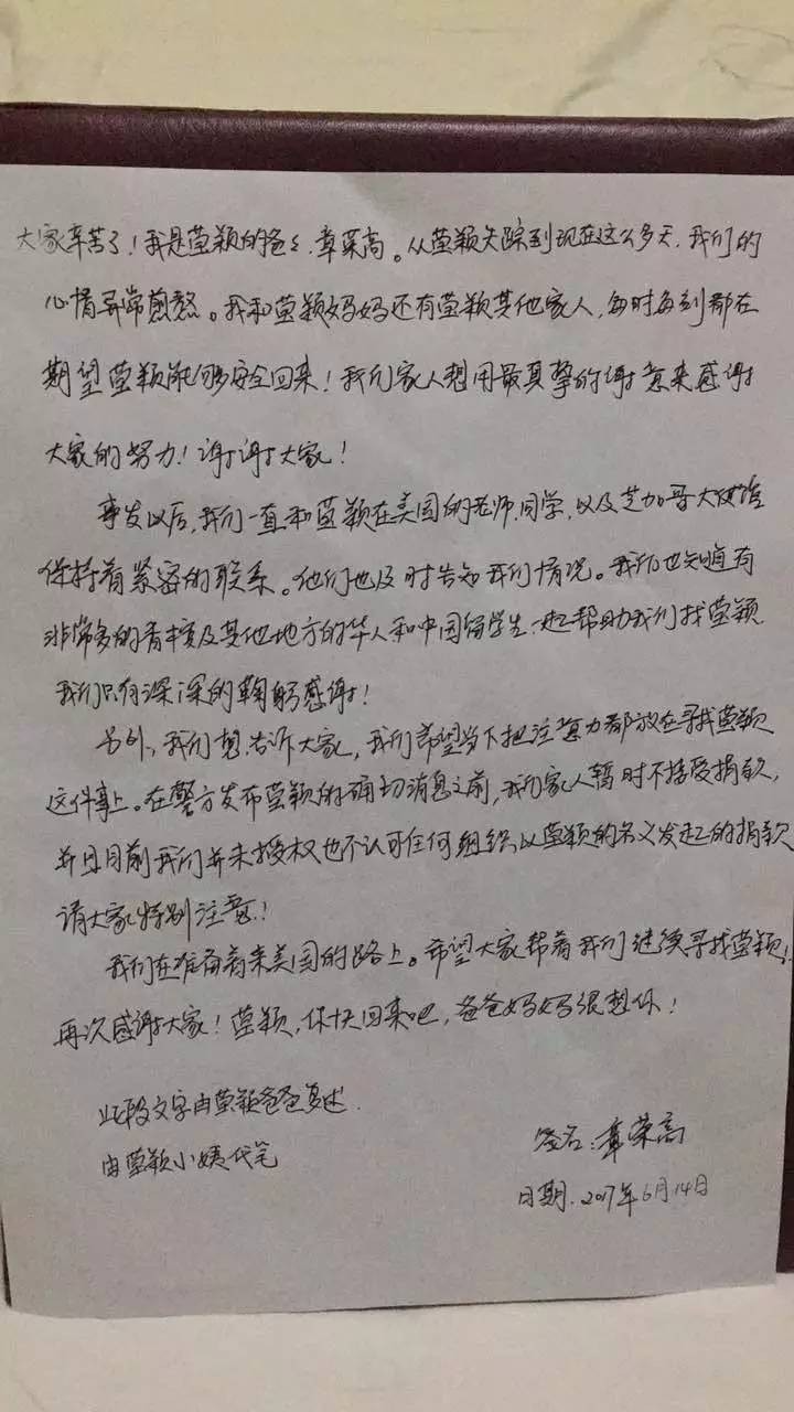 ▌6月14日,章莹颖家人发表公开信
