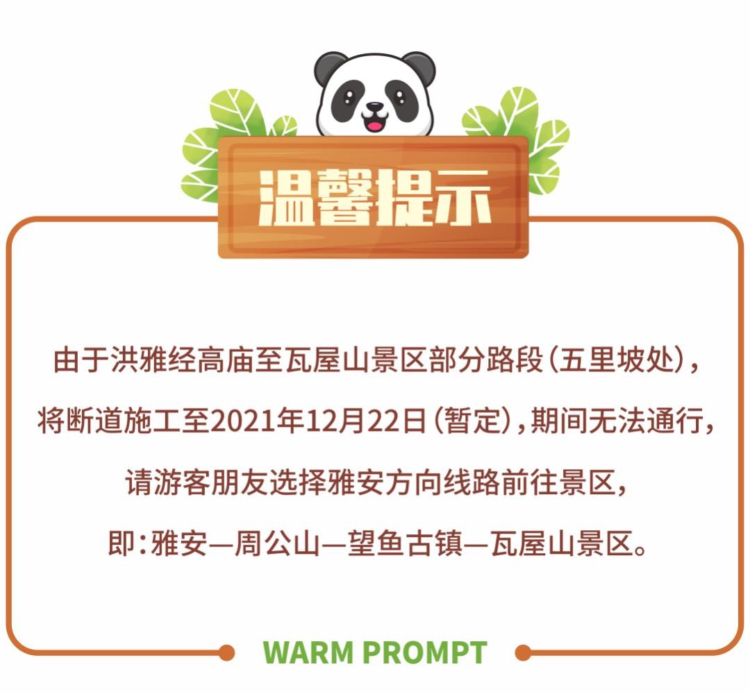 由于洪雅经高庙至瓦屋山景区部分路段(五里坡处),将断道施工至2021年12月22日(暂定),期间无法通行,请游客朋友选择雅安方向线路前往景区,