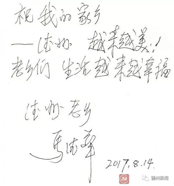 采访的最后,马德华为本报题词,寄语家乡人:“祝我的家乡德州越来越美,老乡们生活越来越幸福——德州老乡马德华。 ”