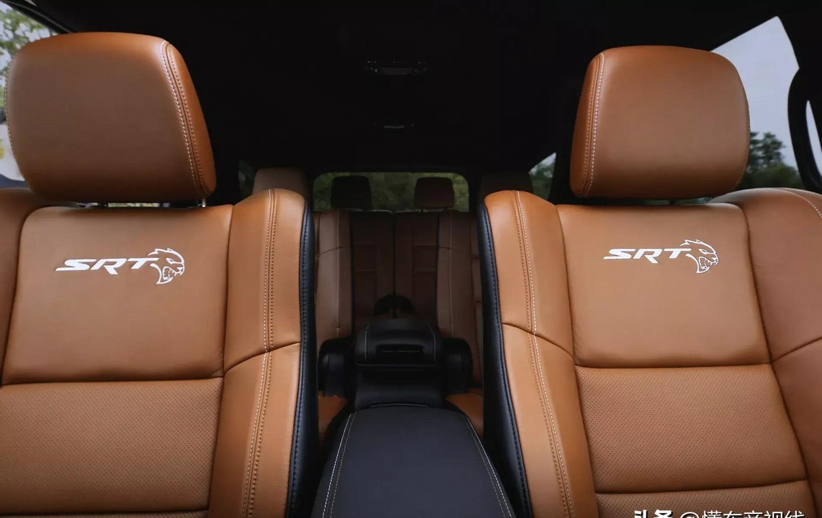 Durango SRTHellcat Brass Monkey魅力远不止于此,它内饰设计上也下足功夫,力求为驾乘者打造一个舒适、豪华移动空间,真皮与翻毛皮包裹方向盘,棕色与黑色搭配座椅,则营造出一种典雅而又不失运动氛围
