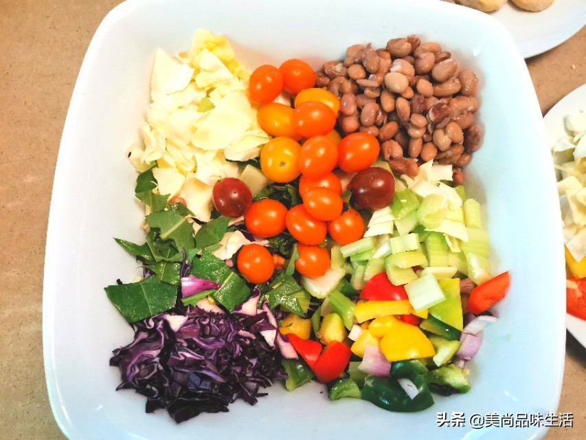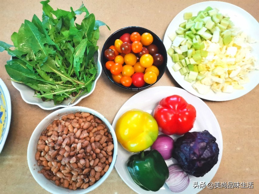 蔬菜:红、黄、绿彩椒各一个,紫甘蓝、洋葱、包心菜、西芹、樱桃番茄、蒲公英叶