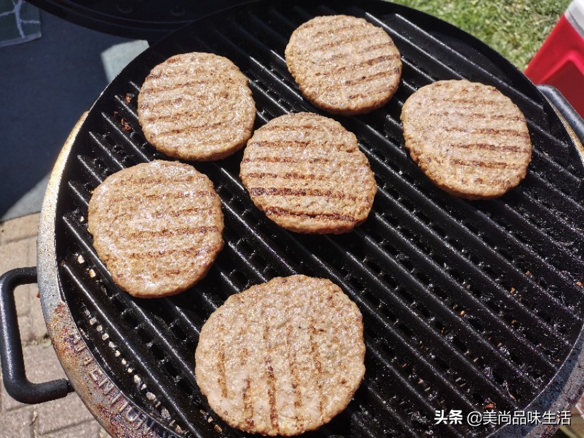 2、烤炉上刷上一层油,将肉饼放在烤炉上烤到两面焦褐色,完全熟了为止。