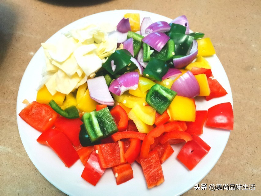 将彩椒、紫洋葱、包心菜切成小块,用竹签分别将上述食材间隔依次串起来。