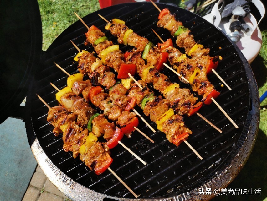 4、户外烤炉加热后,烤网上刷上一层油烤,放上已经做好的肉串,将腌料汁刷在串上,烤约10分钟,翻面后再刷腌料汁,烤约10分钟,直到肉完全熟透,就可以吃了。吃的时候可以蘸上烧烤酱、辣椒酱或你喜欢的酱料。