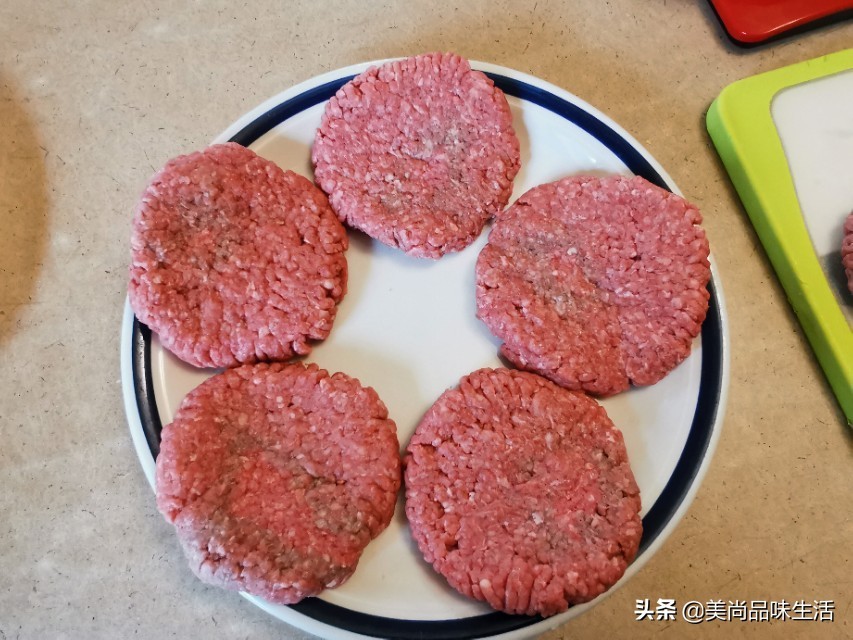 1、将牛肉末和调料混合均匀,做成大小约120克的牛肉饼。