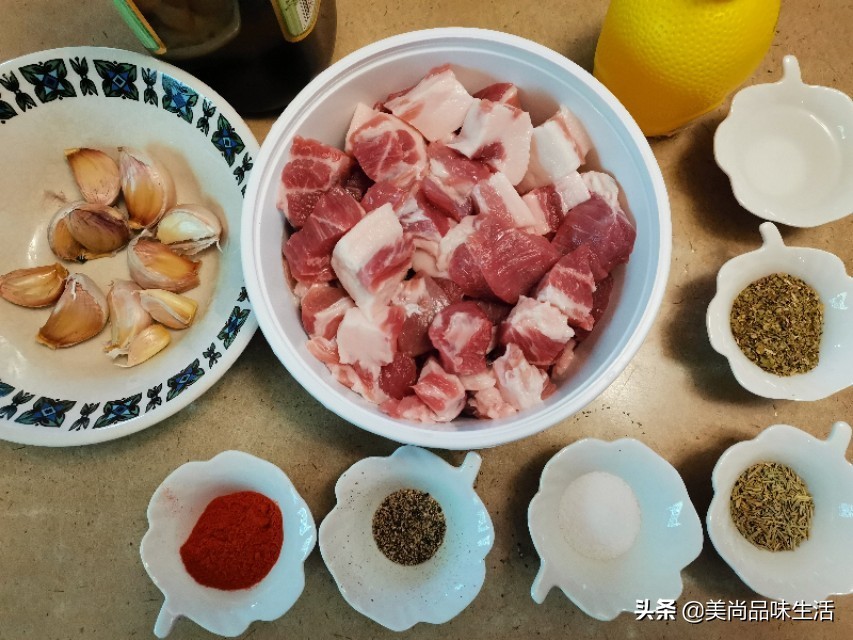 腌料:10粒蒜头、10克干的牛至(也叫披萨草)、10克干的迷迭香草、5克红椒粉、5克盐、5克黑胡椒、60克橄榄油、15毫升柠檬汁。