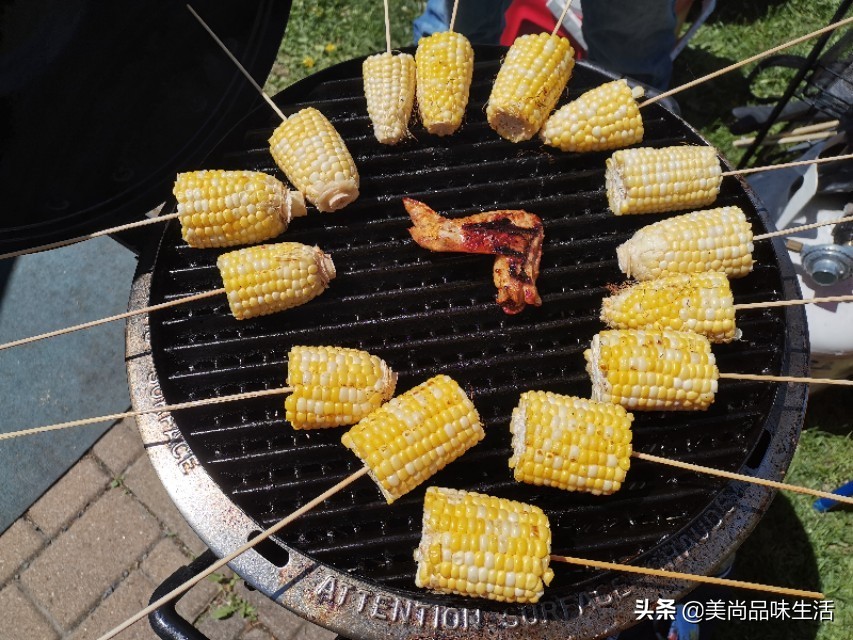 玉米是户外烧烤很方便、实惠的食材,玉米准备起来非常简单,只需将每根玉米等分成3块,分别用短竹签插在玉米芯即可。