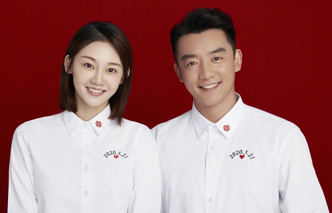照片中郑恺与苗苗都穿着一身有“2020.5.21”字样的情侣衬衫,脸上贴着红色爱心或者“囍”字贴纸,手上拿着结婚证,对着镜头摆出各种姿势,非常可爱。