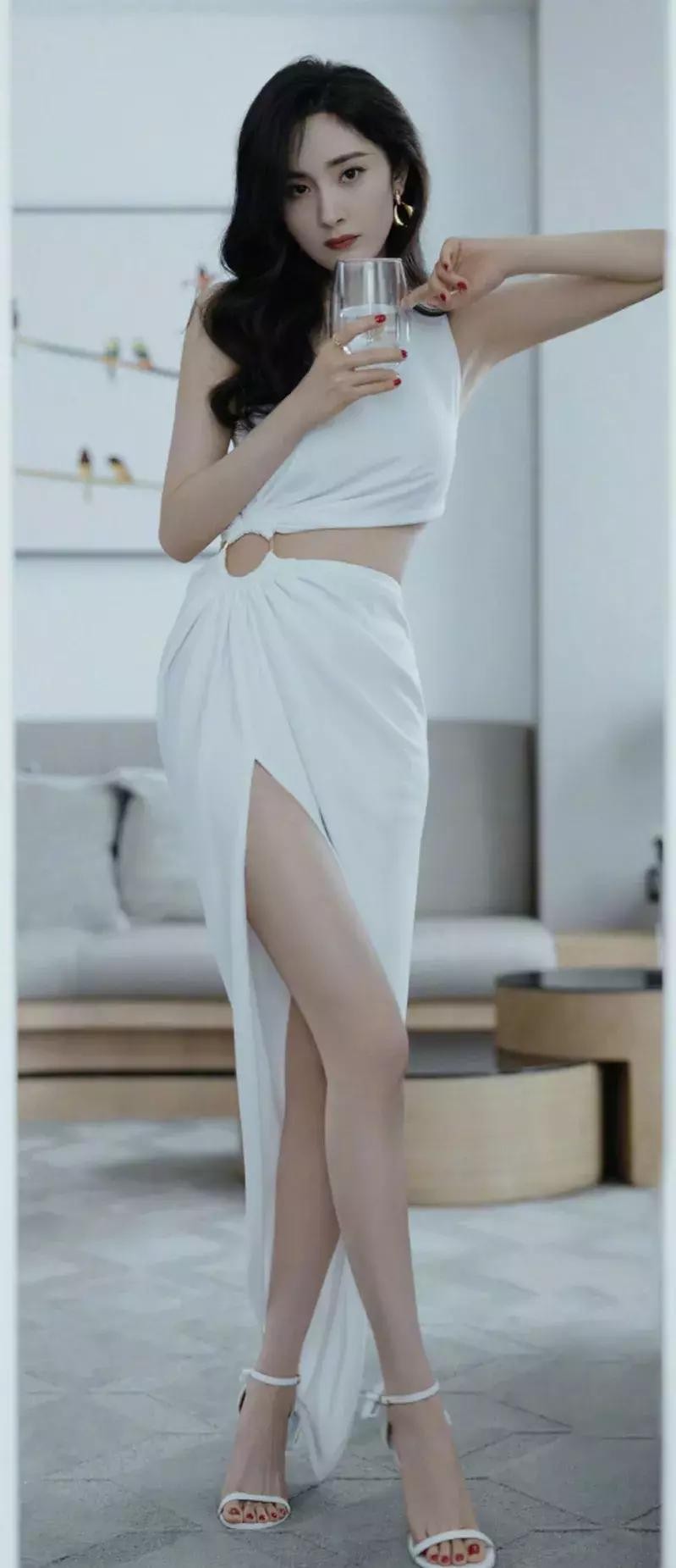 杨幂晒最新写真照片,一袭斜肩露腰开高衩长裙,身材比例抢镜。