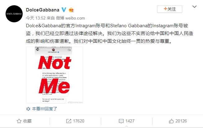 “DG官方Intragram账号和Stefano Gabbana的Instagram账号被盗,我们已经立即通过法律途径解决。我们为这些不实言论给中国和中国人民造成的影响和伤害道歉。我们对中国和中国文化始终一贯的热爱与尊重。”