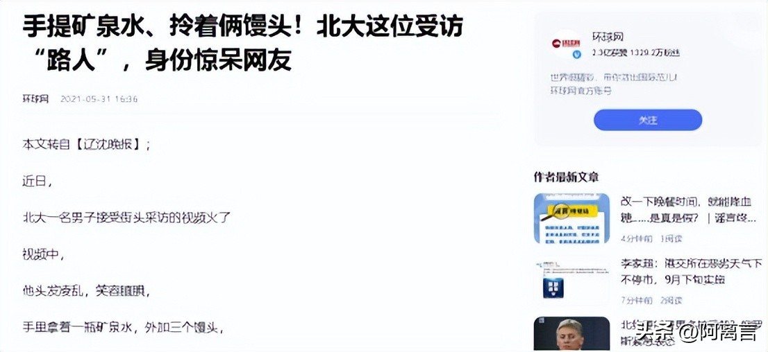 以上内容参考自环球网2021年5月31日关于“手提矿泉水、拎着俩馒头!北大这位受访“路人”,身份惊呆网友”的报道