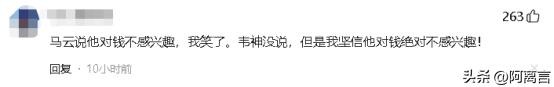 配文中,称自己对马云所说的对钱不感兴趣的话,不是那么的相信,但是假如韦东奕说这样的话,那么自己就坚信不疑。